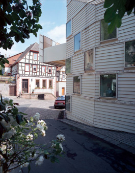 is an urban ensemble within the medieval town of Gelnhausen. It is a concrete utopia of the duality of public and private space. Artistic works in and on the house expand and deepen the architectonic narrative and encourage to lasting dialogue.